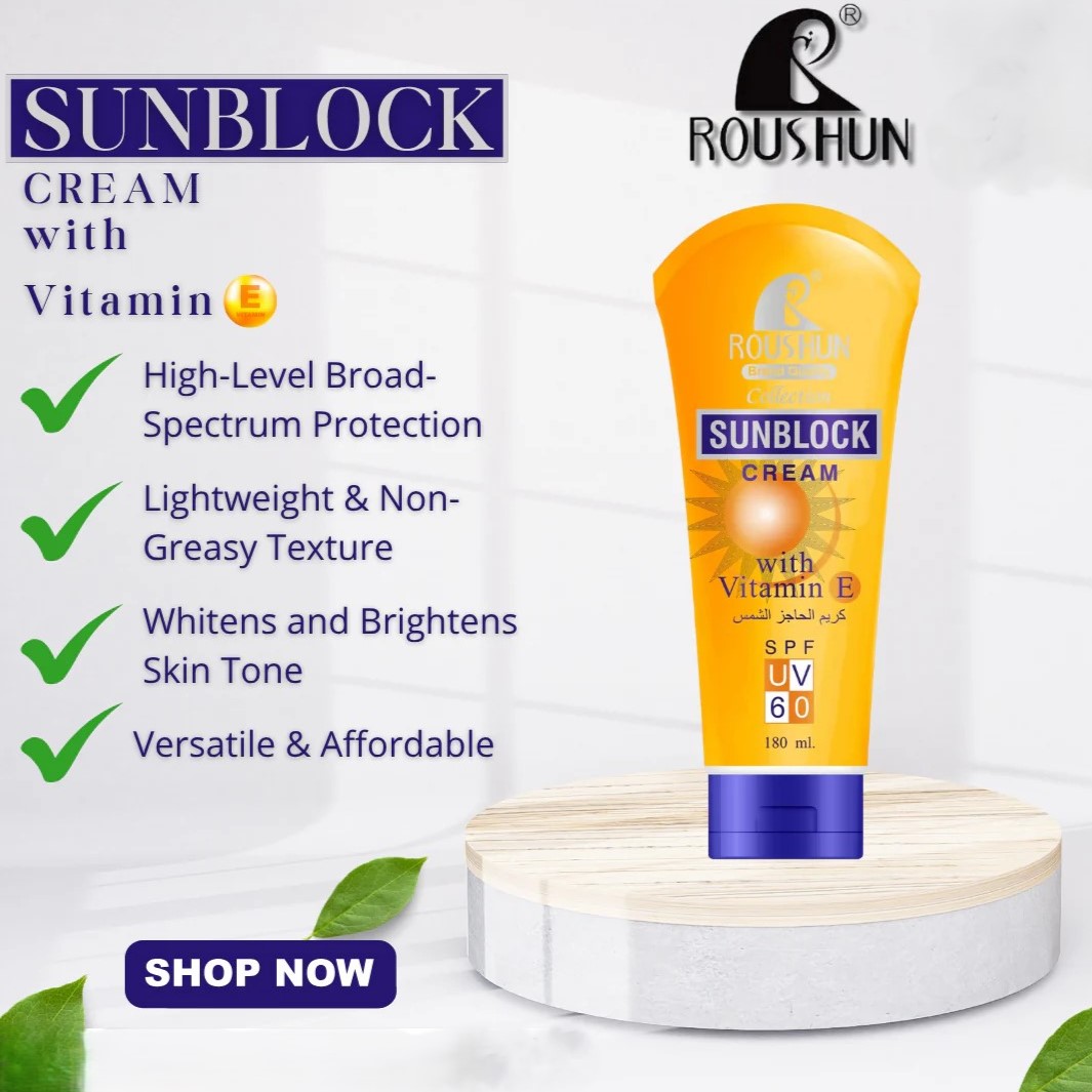 Roushun Sunblock Cream SPF60 with Vitamin E is your skin’s ultimate “sun umbrella.”