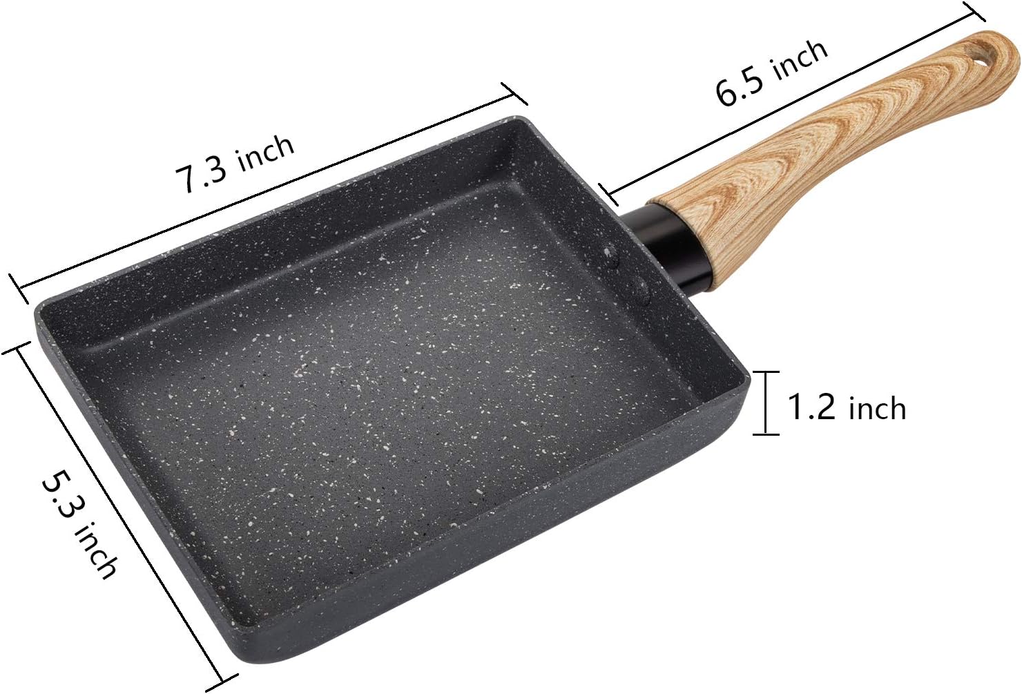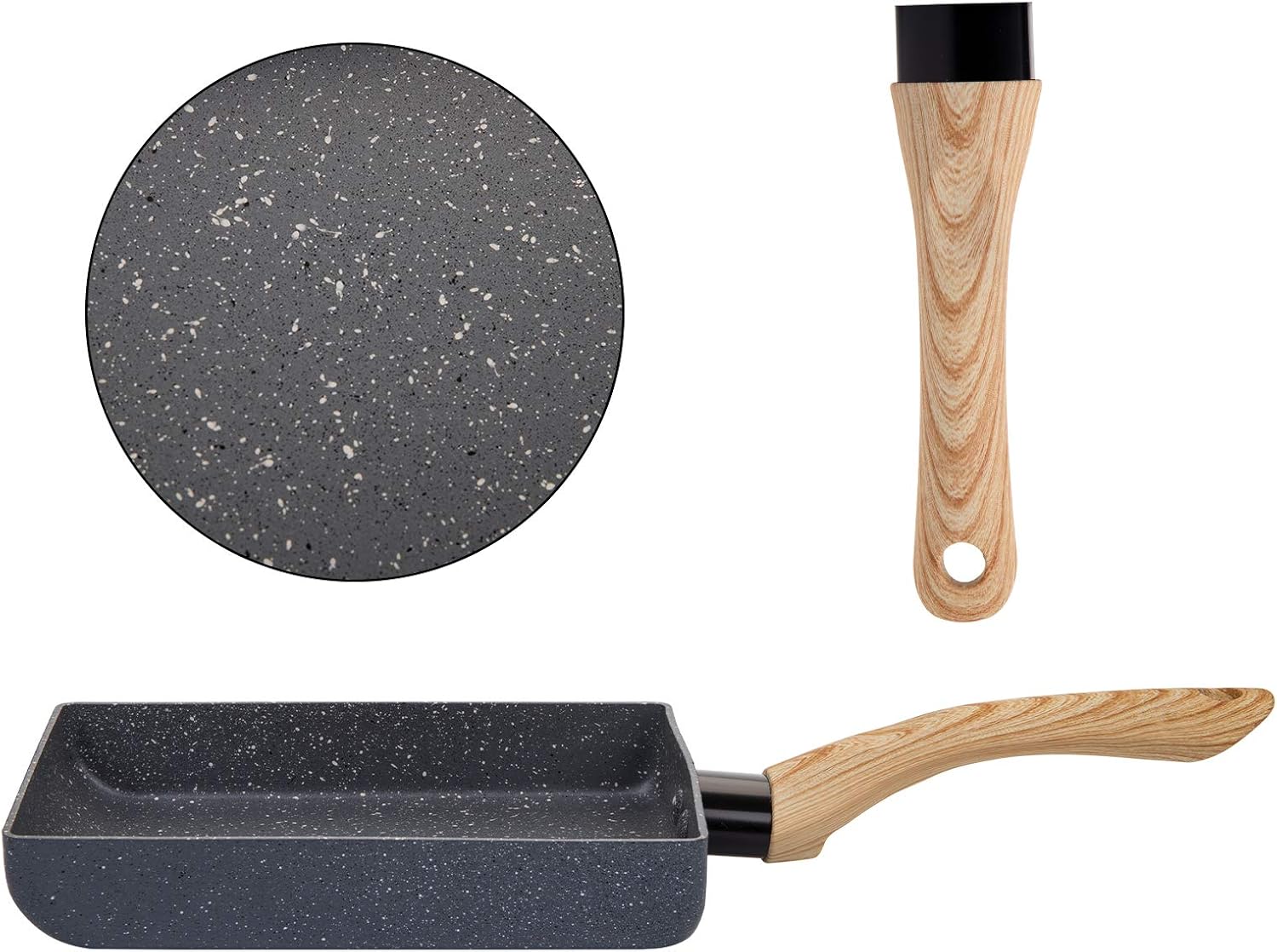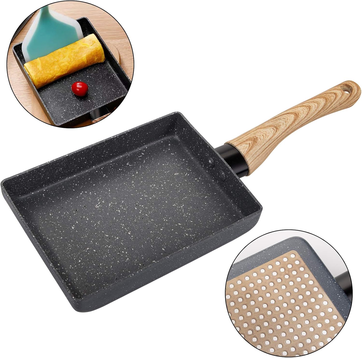 The unique rectangular sloped shape allows easy flipping, while the wood-effect anti-scalding handle provides a safe, comfortable grip. Its stainless steel magnetic conductive base makes it compatible with gas stoves, induction hobs, electric cooktops, and ceramic stoves.
